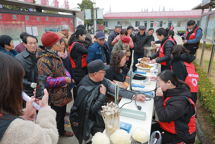 在闞家庵村活動(dòng)中心,黨總支書記陳忠熱情地接待了安惠江海志愿者一行,并簡(jiǎn)要介紹村情。縱有春寒料峭,也抵擋不住大家的熱情,學(xué)雷鋒活動(dòng)吸引了眾多村民前來參加。安惠江海志愿者熱心地為村民們測(cè)量血壓,提供健康咨詢。安惠會(huì)議中心大廚精心準(zhǔn)備了美味的菌菇菜肴:黑椒汁杏鮑菇、糖醋木耳、蛋黃蟹味菇、南瓜茸銀耳,引得村民們連連豎起大拇指:“好吃好吃真好吃!”這些菌菇要怎么烹飪?里面加了什么材料?吃了對(duì)人體有什么好處?安惠江海志愿者詳細(xì)地為村民們一一解答,并為他們普及“一葷一素一菇”的健康飲食理念。