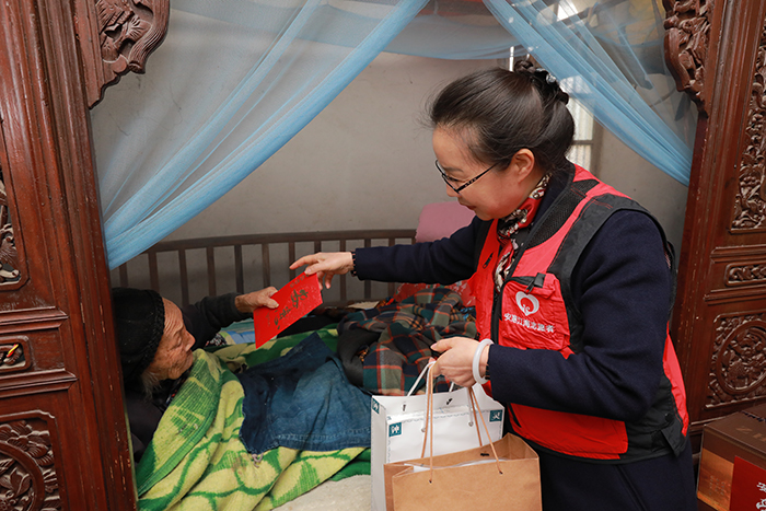 在100周歲的羌蘭芹和101周歲的李永圣兩位老人家中,安惠公司副董事長(zhǎng)陸漢萍和他們親切交談,并送上慰問金、芝草玉液酒、博谷茶和菌菇等慰問物資,祝愿他們身體健康、幸福綿長(zhǎng)。她說,家有一老,如有一寶,我們要用實(shí)際行動(dòng)多給老人關(guān)心和關(guān)愛,讓所有老人都能有一個(gè)幸福美滿的晚年。
